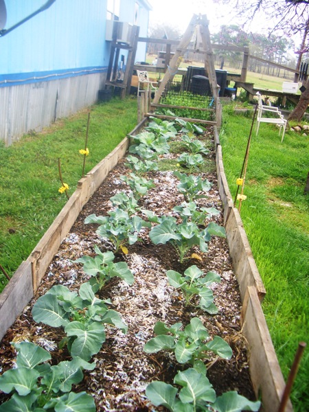 Here is a tall shot of the bed where the brassicas are. Closer are broccoli and farther are cabbage. Most of the cabbage will end up as homemade sauerkraut!