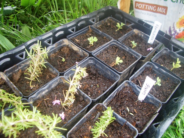 Another trial of rosemary cuttings (haven’t had much success in the past, but why not try again?); one lovage plant, which will hopefully be my heat-tolerant perennial alternative to celery, and fenugreek for the chickens and cows. I don’t know why I ever bought fenugreek seed, but I did, and since I don’t do much Indian cooking, I plan to give it to the critters for a tasty snack. The word “fenugreek” means “Greek hay,” and supposedly was used to make cows eat spoiled hay. I guess that means they really like the taste, so I’ll grow a little to make them happy.