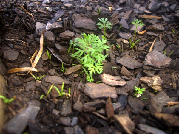 Here are the first of the true carrot leaves. Now for the hard part—thinning!